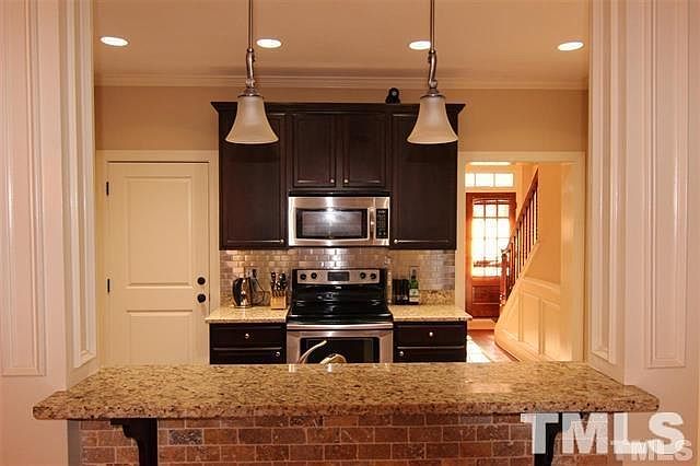 3 BR, 3.5 bath, Upgraded townhome with hardwood flooring, granite countertops, stainless steel appliance, and subway tile backsplash. Open concept first floor. Under mount lighting under FP mantle & brkfst bar. 2 lg brs. on 2n floor- each w/ own bath & w-i-c 3rd floor bonus room has built ins for electronics & wine frig. Notice the premium upgraded carpet too! Full bath and closet make it ideal for 3rd bedroom. Great location near RTP. One car garage.
