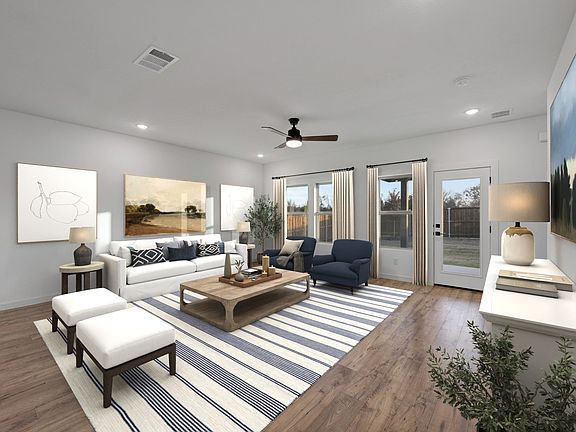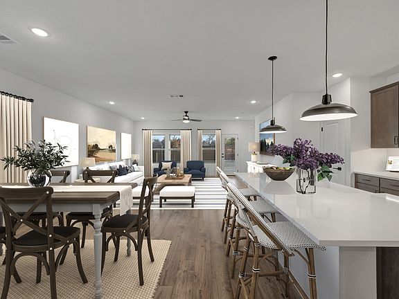 This Tigris II plan offers beautiful laminate flooring in the entry, great room, kitchen and dining area. Open concept with a bright, welcoming kitchen that showcases granite countertops, dark stain shaker cabinets, black metal shade pendant lighting, and stainless steel appliances. The open-concept layout connects all living areas, adding to the home's spacious feel. Enjoy family time upstairs in the loft, which conveniently links to three secondary bedrooms. A covered patio extends off the great room, making for perfect outdoor family get-togethers.