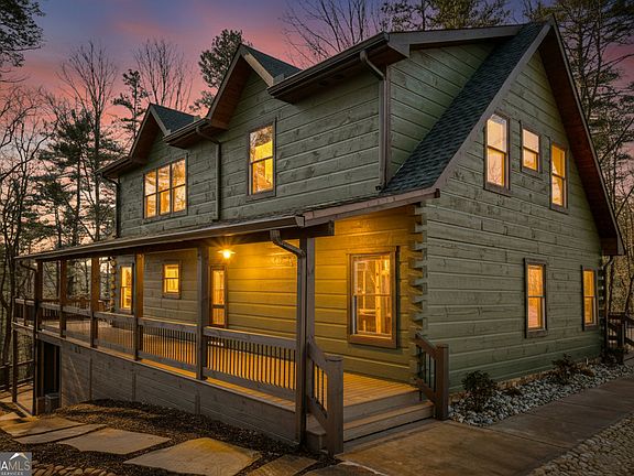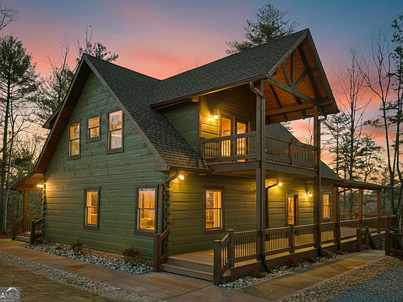 Tucked away in the heart of the mountains, this LUXURY MOUNTAIN RETREAT features authentic true log construction, offering a rare blend of natural beauty and refined craftsmanship on 2.46 acres. Wake each morning to year-round MOUNTAIN & CREEK VIEWS & enjoy the soothing sights & sounds of Mountaintown Creek flowing below, w/ 111 feet of creek frontage. Professionally decorated & selling FURNISHED w/ a curated collection, each piece has been intentionally selected to enhance the home's character & create a warm, cohesive living experience-balancing rustic charm w/ modern luxury. The open-concept great room features vaulted beamed ceilings, shiplap accents, & a modern electric fireplace w/ a porcelain tile feature wall, while the chef's kitchen showcases exposed beams, a marble waterfall island, copper farmhouse sink, 36" stainless gas range, & designer tile backsplash.The main-level primary suite offers dual walk-in closets, a spa-like ensuite w/ marble tile & a double vanity, along with a mudroom, pantry & laundry on the main level. Upstairs includes an oversized LOFT w/ a custom iron railing & mountain & creek views, two additional bedrooms (one w/ a private covered porch), & a full bath. The finished terrace level is built for entertaining, featuring a wet bar w/ wine cooler, gas-log stone fireplace, full spa-like bath, & flexible bonus room ideal for extra sleeping/bunk room, home office, or gym. Outdoor living shines w/ a wrap-around main-level deck, generous patio w/ fire-pit area & professionally landscaped grounds. Enjoy peace of mind w/ a full-house generator & the assurance the home is not located in a flood plain. Located in a small private gated community just 10 minutes from Downtown Ellijay, this property features all-paved access, no steep drives, plentiful parking, & allows short-term rentals. This property is ideal as a full-time residence, second home, or investment property. (An additional adjacent 2.37-acre lot is also available for purchase.)