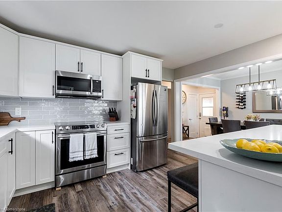 STOP THE CAR!! This gorgeous, jaw dropping 3 bed 2 bath 3 level back-split home is an absolute show stopper inside & out, & pride of ownership is evident! Located on a quiet crescent across from beautiful Brent Park, this charming home has great curb appeal w/dbl. wide asphalt drive (4 cars) w/single garage (2014) & man door, dual concrete walkways & porch that are adorned by magnificent perennial gardens. Inside, be amazed by the lux. vinyl flooring (2024), pot lights, updated white kitchen (2022) w/backsplash, quartz counters w/sit-up breakfast bar & S.S. fridge/stove, micro-range & dishwasher (2019) w/updated lighting & California shutters on most windows throughout & there is a nicely updated 2 pc bath! The nice size living room features a classic stone faux f/p w/mantel w/oversize windows looking over that park we mentioned. Upstairs find a good sized principle bedroom w/fully updated 4 pc bath (2022) and two more perfectly sized bedrooms. Downstairs find a large rec-room area (currently used as 4th bedroom) that includes a faux f/p w/stone fascia & mantel as well as more pot lighting & barn door to a walk-in closet! There is also a laundry room w/plenty of storage under the stairs & a massive crawl space for all your extra holiday seasonal items etc.. The backyard features a permanent awning (12 x 16) that covers the maintenance free concrete patio while keeping you cool/dry on those hot/rainy days! However if you're looking to catch some rays or feel like watching shooting stars then feel free to enjoy it from the bonus interlock patio (11 x 13) perfect for your dancing & dining pleasure! Got kids/grandkids then the yard will be a perfect fit to play catch or kick a ball around in your fenced yard (2024) & when done just put away those toys in your storage shed (7.6 x 9.6) on a poured 10 x 10 concrete pad. Updates incl. Roof 2014, Furnace & A/C 2014, Hepa filter, Tankless HWT & Water softener 2021 as well as windows & exterior doors!