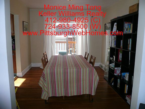 Spacious home in the serene Swisshelm Park area of Squirrel Hill. Open concept first floor with updated kitchen and natural cork floors. Sliding doors give convenient access to the deck and yard for entertaining. Nicely updated bath with custom sink and cabinet. 2nd floor bedroom has additional space that can be used as a walk in closet or office space. Alternately 3rd floor bedroom can be designated as master bedroom and has ample closet space. Detached garage and additional parking spaces in the driveway.