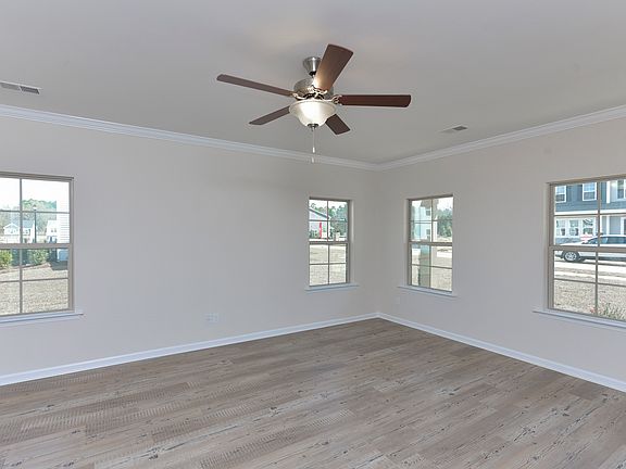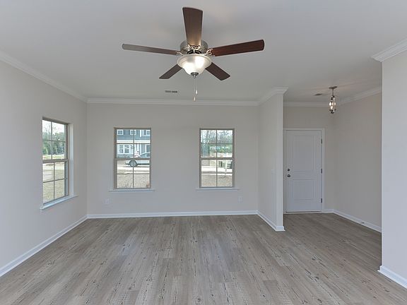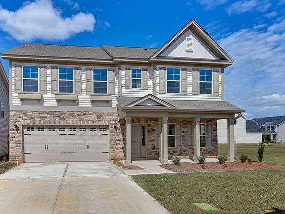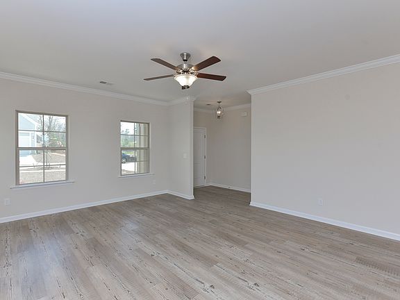The Langford is a two-story home with five bedrooms and three baths. The foyer opens to the large family room and arched openings leads to the kitchen and dining area. A guest suite with a full bath is located on the main floor, as well. Upgraded flooring runs throughout the living areas downstairs accentuated by crown molding. The staircase is tucked in a corner off of the kitchen with hardwood stairs, white risers, and a handrail with metal spindles that lead you upstairs. Three upstairs secondary bedrooms all feature large closets. The master suite features a sitting area, large walk-in closet and a master bath with a water closet and plentiful storage. Enjoy the backyard with a covered patio and ceiling fan plus additional grill pad. Three-zone irrigation included and garage door opener.