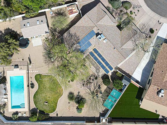 Premier cul de sac lot over 1/3 ACRE+ with NO HOA! Nestled on one of the largest lots in the neighborhood this Charming Home is set back and secluded. Enter through the custom designed Iron Security Gate to the double door Entry. The Foyer boasts beautiful vinyl flooring which leads to the sunlit formal Living and Dining rooms with huge view windows and welcoming ambiance, opening to each other for easy entertaining. The stunning Contemporary Kitchen with Quartz counters, custom hardwood Cabinets, SS appliances, modern Tile backsplash and a walk-in Pantry. The spacious Family room or Dining area is open to the Kitchen, with a back Patio exit for easy outdoor entertaining. Retreat to the Primary Suite at days end and lounge in the Sitting rm or use the private exit to the peaceful covered Patio. The Primary bedroom has both a walk-in closet and double door closet. The remodeled Primary Bath with custom hardwood cabinetry, double sinks, Quartz counters and oversize tile surround shower. 2 additional bedrooms with ample storage, remodeled Guest Bath with stunning tile surround tub/shower. Custom hardwood cabinets and Quartz counters. The manicured Desert Oasis is your own mini botanical garden. Open air pathways lead you from the expansive covered Patio to the crystal-clear fenced Diving Pool and Gazebo. Enjoy sunset views, lounge in the pool or dine alfresco on the spacious covered Patio. Freestanding Accessory Building, wired with Electrical, has potential as a Home Office, Studio, Home Gym. Leased 4.9kW Solar, on house, with low FIXED PAYMENTS of $57.01 monthly. The lease is transferable and with Solar efficiency, you'll have no problem staying COOL all summer long! Well located in N. Chandler with easy access to the 101 and 60 fwys, Shopping and Dining and a short walk to Shawnee Park and Pomeroy Elementary School.