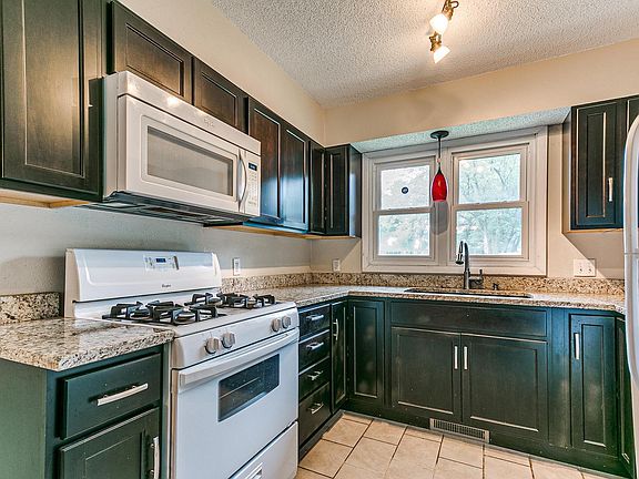 The updated kitchen has granite countertops and dark cherry cabinets, newer light fixtures.