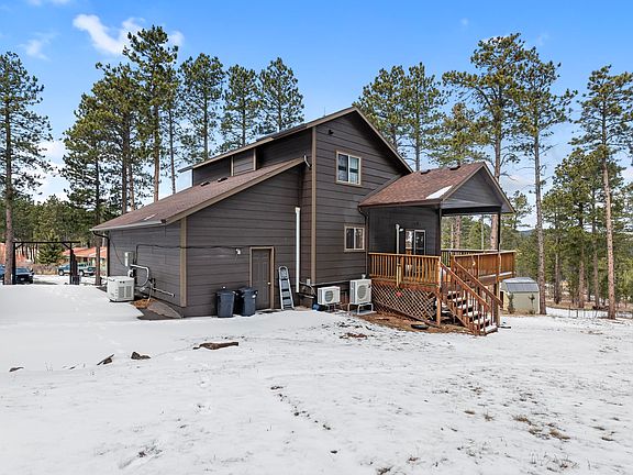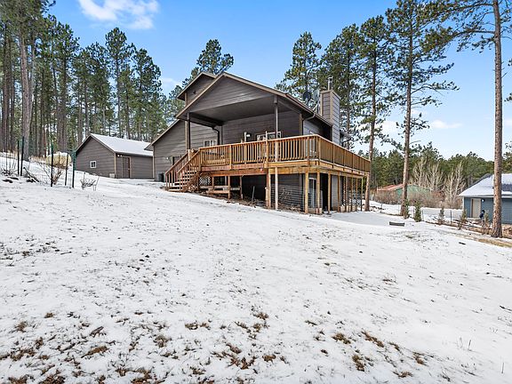 Welcome to Kalamunda (a home among the trees). This property features 8.61 total acres of essential tree'd Black Hills beauty. With 4 bedrooms (2NTC) and 3 full bathrooms you won't want to leave the property. Garage space includes 1 attached garage, a 2 car detached garage and a separate RV garage - SO MUCH SPACE. The entire upper level is your primary bedroom with large walk-in closet and attached updated bathroom. Your main floor features 1 bedroom and full bathroom, kitchen and dining area as well as a functioning wood burning fireplace. The lower level does have a walkout sliding door along with 2 bedrooms and another full bathroom!