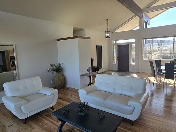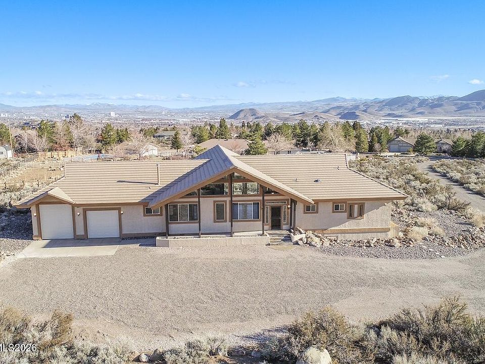 Experience unparalleled 360° city and mountain views from every angle of this stunning single-story, custom-built South Reno residence. Perfectly situated on a premium 2.88-acre lot bordering BLM land, this property offers exceptional privacy and a rare sense of serenity. Inside, you'll find vaulted ceilings, expansive picture windows, and an open-concept great room that fill the home with natural light. A complete modern remodel showcases refined finishes including hardwood and stone flooring, a sleek designer kitchen with striking granite slab counters and backsplash, stainless steel appliances, and exquisite tile work. The spacious three-car garage features an oversized door and workshop area. Step outside to enjoy sweeping city views from the covered rear deck or take in the mountain vistas from the inviting front porch—perfect for relaxing or entertaining. Other highlights include a luxurious primary suite with a jetted soaking tub and walk-in rain shower, a stucco exterior with a concrete tile roof, ample space for RVs, boats, and future outbuildings, and no HOA. This quiet yet convenient location is close to Thomas Creek Park, schools (Hunsberger Elementary, Herz Middle, Sage Ridge), shopping, dining, and only an 18-minute drive to Mt. Rose Ski Resort.