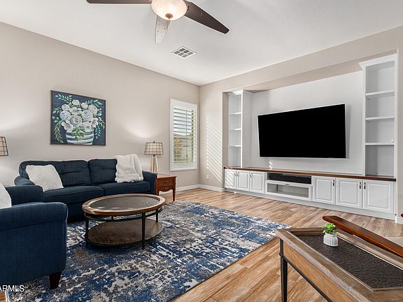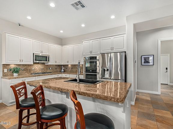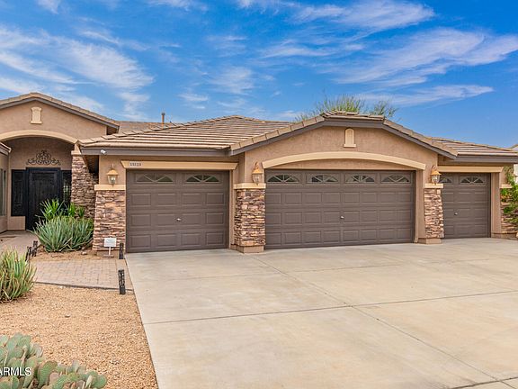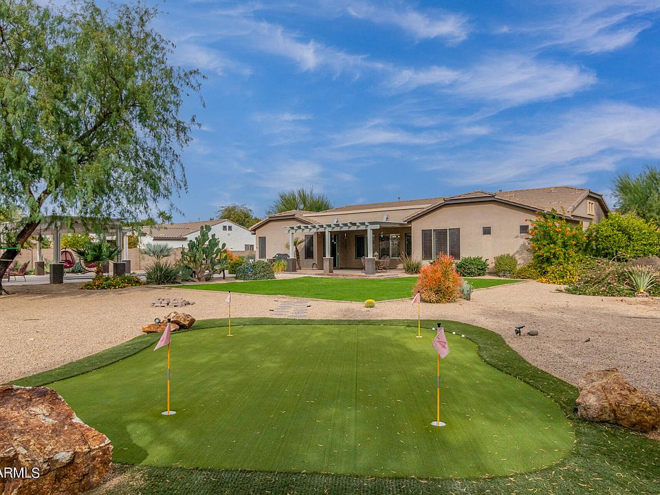 Welcome home to your own private oasis in Litchfield Park. This stunning home is located in a premiere gated community within walking distance to A+ rated schools. You will feel at home from the moment you enter through the custom iron front door. Once inside you will appreciate the neutral interior with 4 large bds, 3.5 baths and enough extra room for everyone in your family to spread out. Tile and plank flooring, plantation shutters, media center and a huge 4 car garage to store all your toys. Sit and relax on this this extended patio overlooking the gorgeous backyard with sparkling swimming pool, firetable and mountain views. Refaced Kitchen Cabinets, new Roof, A/C, Pool Pump and Filter, heavy duty drip lines and freshly painted interior. This home is move-in ready! The grand main suite is a sanctuary of relaxation featuring a sitting room, decorative ceiling fans, backyard access, a sliding barn door to the deluxe ensuite w/dual vanities, & a sizable walk-in closet. Escape to the backyard paradise that invites you to unwind & have fun! It boasts a covered patio, pavers, a verdant lawn, a putting green, a fire pit, a cozy pergola, & a refreshing pool ready to enjoy. Experience the grandeur that awaits in every corner of this remarkable residence!