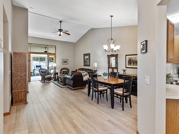 A rare opportunity to own this gorgeous one-level living townhome in the Eagle Creek Bluff community! This well-maintained home offers a great layout with new luxury vinyl plank flooring, vaulted living room ceilings, a cozy gas fireplace, and natural light that streams throughout the home from the sunroom and kitchen. The kitchen has ample cabinets and counter space, stainless steel appliances, a pantry, and a center island with butcher block countertop. The laundry room is conveniently located just off the kitchen and the adjoining dining room is the perfect space to host guests with a pass-through window from the kitchen. The spacious primary bedroom includes a large walk-in closet, room darkening shades, an en suite with a low threshold shower and a luxurious bidet. The 2nd bedroom offers plenty of space for a queen-sized bed and dresser or use it as a combo bedroom and office. The adjoining bathroom offers a tub, new flooring and large linen closet. Step through the French doors to the bright sunroom and step out on to the private patio adorned by a tree-lined backyard that makes this space feel like a private oasis. You'll be situated on a cul-de-sac in a quiet neighborhood near trails, parks, dining, & great freeway access. Enjoy the HOA taking care of the snow and lawn work and just move in and relax in your new home! Other notes: Water heater (2021), Furnace (2019), Water softener (2019), A/C (2017), Dishwasher (2025)