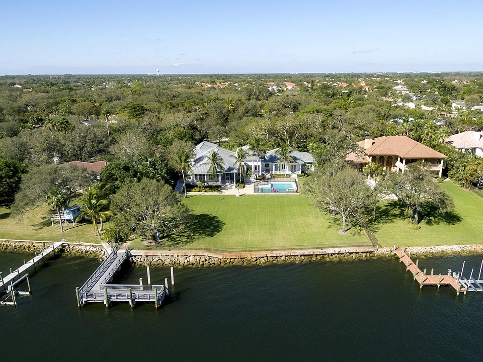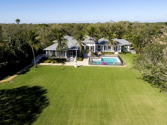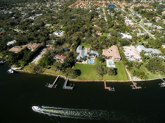 This custom built and impeccably designed estate home is on 1.13 acres located directly on the Intracoastal Waterway. The manicured front lawn features large Oak and Banyan trees and a 4 car garage with a Key West inspired metal roof. A large entrance Foyer has a vaulted ceiling and gas fireplace and is a perfect spot for your holiday decorations. The water views from almost every room in the home are truly spectacular especially from the kitchen and family room which feature tall hurricane impact windows, high end appliances including a Wolf gas range (a high performance cooking range with precise control) a wine cooler with an ice maker and maximum cabinet space with additional large pantry space. From the formal dining area are large water views looking out over the massive back yard.