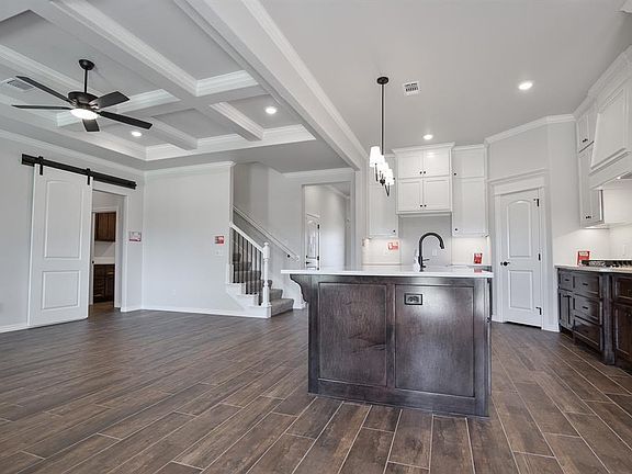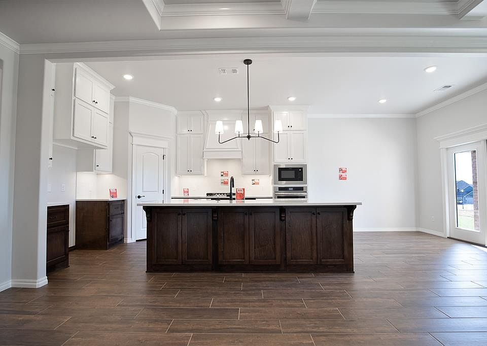 This Shiloh Bonus Room floorplan includes 2,805 Sqft of total living space, which features 2,450 Sqft of indoor living space & 355 Sqft of outdoor living space. There is also a 610 Sqft, three-car garage with a storm shelter installed because, at Homes by Taber, safety is never an option. This defining home offers 4 bedrooms, 3 bathrooms, 2 covered patios, & a large bonus room! The spacious living room features a stunning coffered ceiling, a stacked stone surround center gas fireplace, wood-look tile, elegant crown molding, large windows, Cat6 wiring, & a barndoor. The high-end kitchen supports custom-built cabinets to the ceiling, impressive tile backsplash, built-in stainless steel appliances, a center island, impeccable pendant lighting, a walk-in pantry, & 3 CM countertops. The primary suite offers a sloped ceiling detail, windows, a ceiling fan, our cozy carpet finish, & 2 separate walk-in closets. The attached primary bath features separate vanities, a corner Jetta Whirlpool tub, a private water closet, & a huge walk-in shower! Property is fully sodded with an in-ground sprinkler system in both yards! The covered back patio offers perfection with its wood-burning fireplace, gas line, & TV hookup. Other amenities include Healthy Home technology, a tankless water heater, a whole home air filtration system, R-44 Insulation, & more!