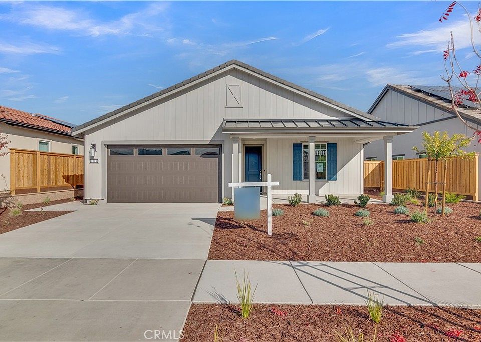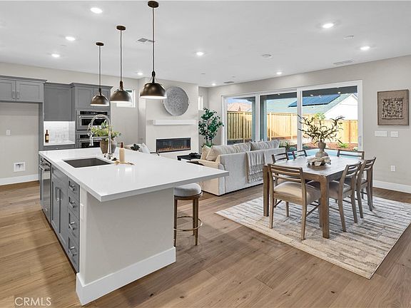 Indulge in wine country living at Trilogy Nevina with this stylish new Affirm home. The gourmet kitchen features quartz counters, designer backsplash, premium KitchenAid appliances, Flint-painted cabinetry, and an expanded pantry. A rolling wall of glass connects the great room to a covered patio with BBQ stub and landscaped yard, while a cozy fireplace with mantel adds warmth and charm inside. The private primary suite includes tall windows, abundant light, and a spa-inspired bath with quartz counters and frameless tiled Shea Shower. Designer accents include engineered wood flooring, plush bedroom carpet, tile baths, two-tone paint, 5½" baseboards, chrome finishes, and LED lighting. A laundry room with sink and cabinetry adds convenience. Life at Trilogy Nevina, with added membership, offers planned resort-style amenities, a vibrant clubhouse, and access to Paso Robles’ wineries, dining, and culture—where every day feels like a retreat.