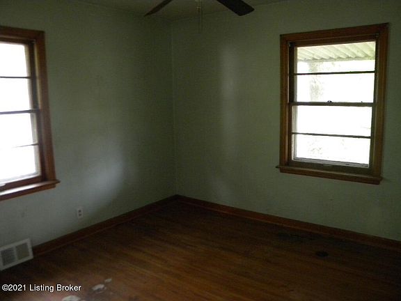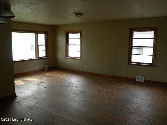 Brick ranch with open floor plan, living/dining room, kitchen, 2 bedrooms, 1 bathroom, hardwood floors, unfinished basement, detached 2 car garage. Equal housing.