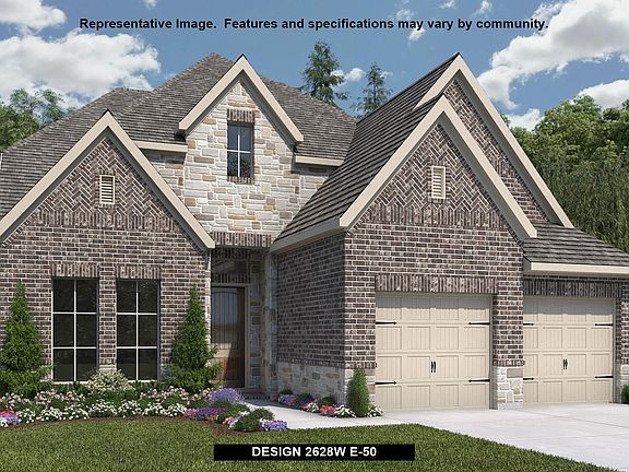 Two-story entry opens to home office with French doors. Open family room with wall of windows and 19-foot ceiling. Large dining room. Kitchen features island with built-in seating space. Primary bedroom. Primary bathroom features dual vanities, garden tub, glass enclosed shower and two walk-in closets. Secondary bedrooms and large game room on second level. Utility room. Two-car garage.