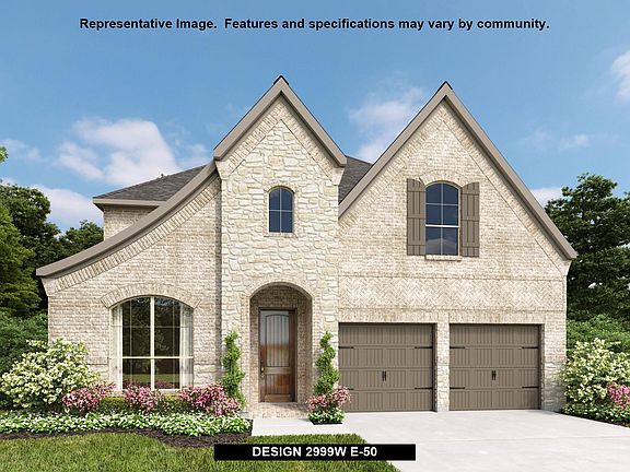 Home office with French doors set at two-story entry. Open kitchen hosts inviting island with built-in seating space. Two-story dining area opens to two-story family room with wall of windows. First-floor primary suite with wall of windows. Dual vanities, garden tub, separate glass-enclosed shower and two walk-in closets in primary bath. A guest suite with full bath is downstairs. Secondary bedrooms, a game room and media room with French doors are upstairs. All bedrooms include walk-in closets. Mud room off three-car garage.