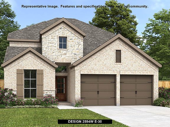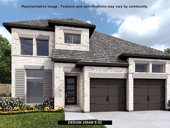 Home office with French doors set at two-story entry. Dining area opens to kitchen and adjacent two-story family room. Kitchen features walk-in pantry and generous island with built-in seating space. Family room features wall of windows. First-floor primary suite includes primary bath with dual vanity, garden tub, separate glass-enclosed shower and two walk-in closets. An additional bedroom is downstairs. A game room and two secondary bedrooms are upstairs. Mud room off two-car garage.