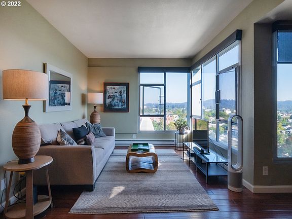 Amazing East/South views from this stylish, 11th floor, corner unit. Engineered hardwood floors,updated bathrooms and fixtures.Stack washer/dryer - A Rarity! Small, open kitchen w/stainless appliances, granite counters and custom cabinets. Two bedrooms w/mirrored closet doors and wool carpets. HOA $415/mo covers water,sewer,garbage,building maintenance and flood insurance. Deeded, covered parking space in secure garage. Visit www.willamettetowers.com for HOA info.