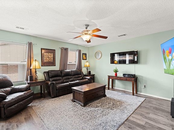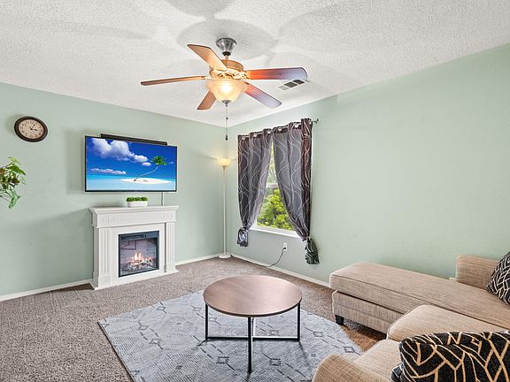 Welcome to this charming two-story home, thoughtfully designed for comfortable living. The inviting kitchen features stainless appliances & an island, perfect for gathering. Solid surface counters & maple cabinetry, adding warmth & character to the home. Downstairs is a second living space offers flexibility for relaxation or entertainment, while upstairs, you'll find the cozy loft & all bedrooms, ensuring privacy & separation from the main living areas. Retreat to the spacious primary suite, complete w/ double sinks, a soaking tub, & a walk-in closet. Two additional bedrooms offer ample space & storage w/ their spacious closets. Stay cool & comfortable w/ ceiling fans & refrigerated AC. With its inviting atmosphere,this home is ready to welcome you!