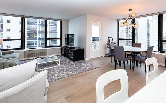 Breathtaking Lake Michigan views from every room - there's nothing like this unit on the market. Every inch of this gigantic 2 bed/2 bath unit has been renovated with great attention to detail. Rarely available south east corner unit with large private terrace perfect for watching the Navy Pier fireworks from the comfort of your own home. The kitchen features custom Italian cabinetry, under and over mount lighting, Ann Sacks tile backsplash, Grohe faucet, waterfall counter island and Bosch integrated appliances. Stunning wide plank wood floors throughout, windows less than 10 yrs. Huge walk-in closet in the master bedroom with in-unit laundry. Storage included. Building features: 24hr doorman, gym, pool & sundeck, bike storage, onsite engineer and management. Heated garage parking included in the price. Only available furnished.