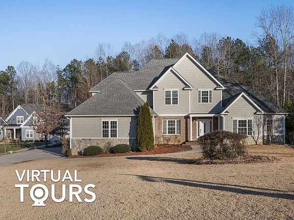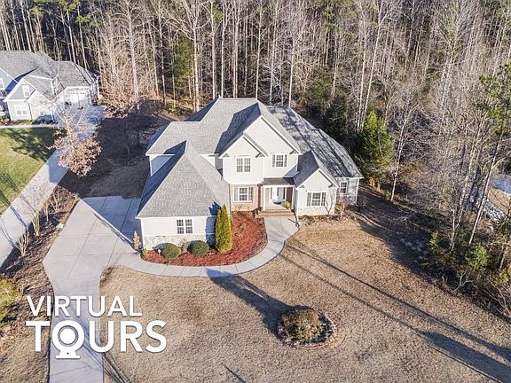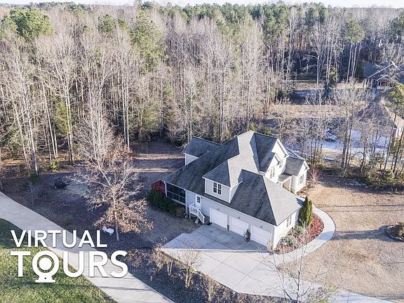 Situated on an acre of land is this gorgeous 5000 sqft home with a gourmet kitchen, multiple living spaces, a finished basement, and large deck! A long driveway ushers you to the front of the home, where wood floors and an abundance of natural light welcome you in. Entertain guests in the formal living and dining rooms, and relax in the great room, complete with a double height ceiling, fireplace, and built-in cabinetry! Cook and dine in the eat-in kitchen, equipped with granite countertops, tile backsplash, a stainless steel fridge, center island, walk-in pantry, and recessed/pendant lighting. From here, French doors lead to the deck, where you can BBQ or lounge while overlooking the tranquil wooded backdrop! When it’s time to wind down, choose from any one of the five bedrooms, four full baths, and two half baths. This lovely home features a first floor master suite which is the largest of the bedrooms and offers a wood vanity and walk-in shower, with a glass door and tile surround! The master also features a double sink and his and hers closet. There is also a finished heated basement with full bathroom, office space and media and gaming area, as well as 4 bedrooms on the second floor! There are plenty of storage spaces throughout the house! A laundry room and three car garage are convenient additions to the home. Outside, there is a covered patio and spacious front and back lawns that await your customization! There is potential for a new owner to put in an in-ground pool! So many possibilities with no HOA! The entire house has been freshly painted equipped with new carpet and light fixtures. Central A/C and Forced Air Heating. Water sprinkler system and tankless water heater. Three car garage. Located near parks, shopping, and dining, with easy access to hwy 264, I-87, and Raleigh!
