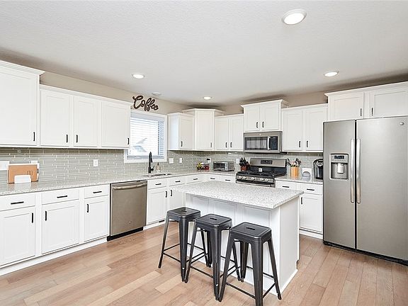 countertops, tiled backsplash, slate appliances, island and extensive pantry. The beautiful engineered hardwood floors run throughout