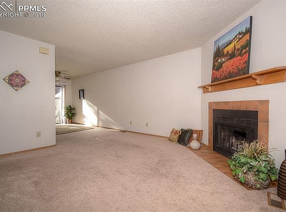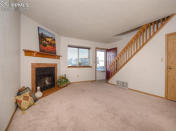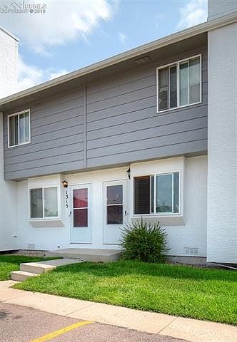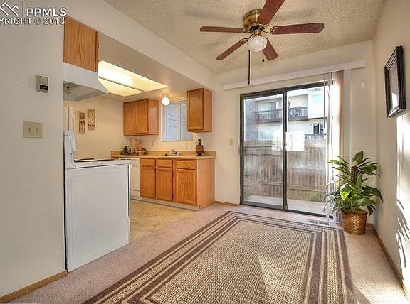 A townhome that fits your life! Great value and fantastic location convenient to Schriever AFB, Peterson AFB and Powers Corridor, this property will go quickly! Living room has a wood-burning fireplace and flows to dining room with walk-out to back patio. Kitchen offers natural light, newer linoleum flooring and white appliances with easy access to dining room area. Upstairs are two bedrooms and a full bath. Laundry is on the upper level and there are assigned parking spots. Lots of grassy areas and mature trees to enjoy in addition to your own private fenced backyard patio with additional storage. This has everything you need!