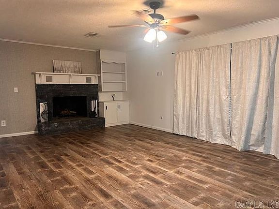 Gas log brick fireplaceFreshly painted interior wallsUpdated vinyl plank flooring