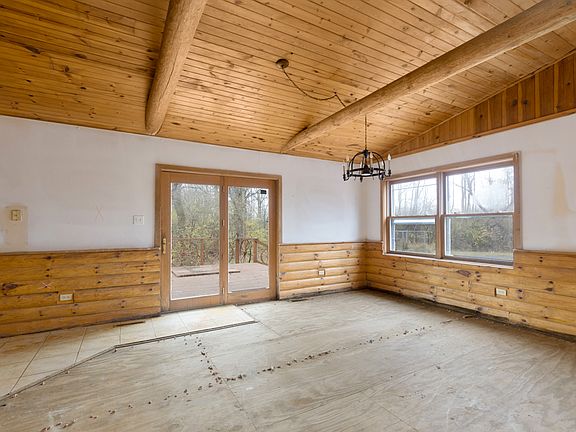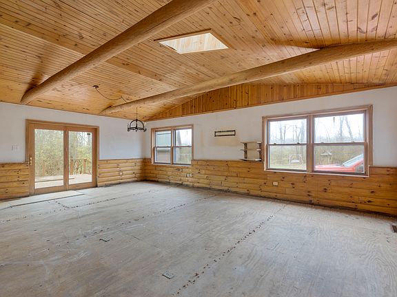 Incredibly rare opportunity to own this log-cabin style 3-bed, 2-bath home situated on serene wooded 1.13-acre lot. This home offers a bright family room with dramatic vaulted wood-plank ceilings, an open kitchen with center island and loads of storage and counter space, spacious bedrooms including a primary suite with private bath, large deck perfect for entertaining, and a detached oversized 2-car garage with finished studio space above. Prime location between Harvard, Woodstock, and Marengo. This home is sold as-is. Room sizes are estimates. Seller does not provide survey. Utilities will not be activated. Cash, rehab or hard money loans only.