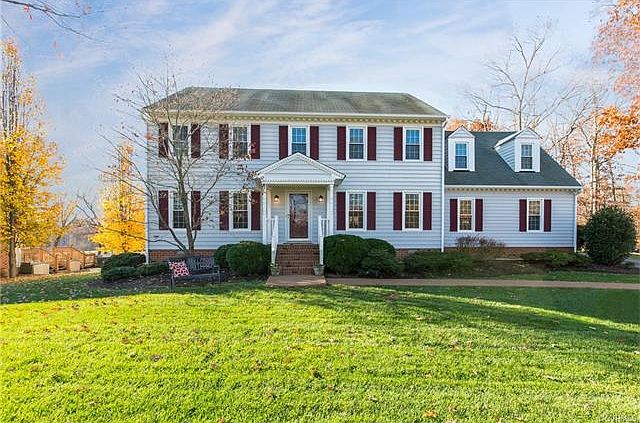 Stunning move in ready colonial in the heart of Midlothian! Low maintenance vinyl siding, new energy efficient windows, irrigation throughout the yard, paved drive and backs to an easement area for maximum privacy in the rear yard. Gorgeous kitchen with granite, travertine backsplash, rustic white cabinetry, bar area, stainless appliances and eat in/breakfast room. Great floor plan for entertaining, family room is open to the kitchen and boasts warm wood floors and beamed ceiling, recessed lights, grand brick hearth gas fireplace and French doors that lead to the morning room a great place to curl up with a good book. Amazing tiered rear deck with retractable sun-cover over the pergola, space for the hot tub and conversation area overlooking the oversized rear yard. Formal living room/office and formal dining rooms. The "Garagio" is heated/cooled but can easily hook up the auto-opener to convert back to a garage for parking. Master is stunning and spacious with his/hers WIC and renovated spa-like bath complete with soak tub, shower and double sinks. Updated hall bath,3 spacious bedrooms complete the 2nd floor. Evergreen or Queensmill are options for pool memberships.