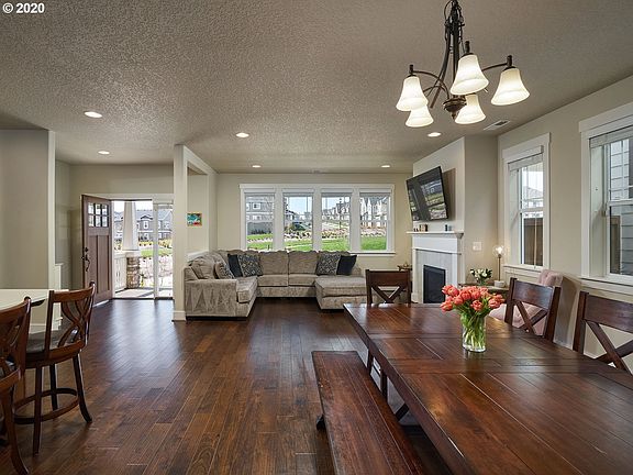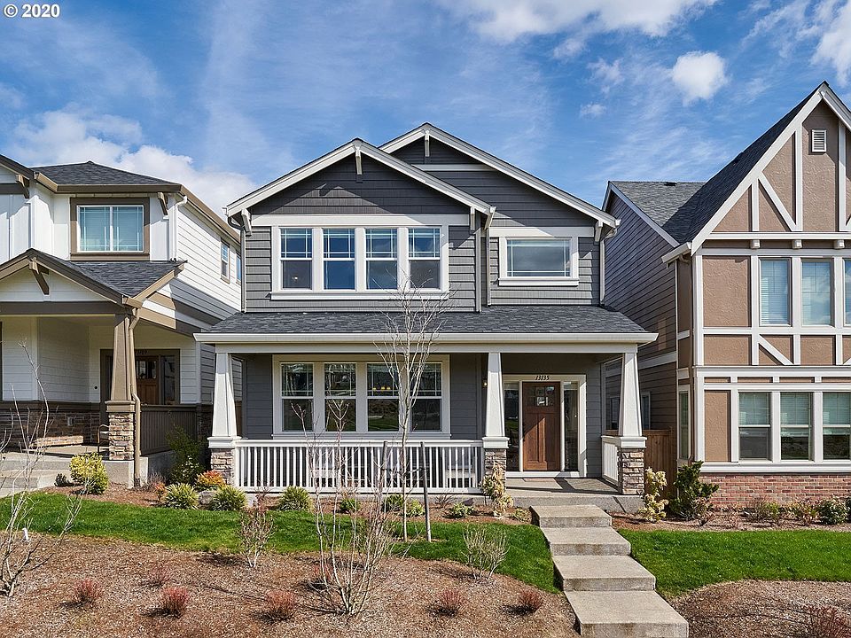 Front door entrance is on the park. Enjoy the view from your covered front porch! Natural light flows through this Craftsman Cottage-style home located in Eastridge at River Terrace. Open floor plan features wood floors, gas fireplace and great main-floor flow. Kitchen has large eating island, quartz counters and stainless steel appliances. Master suite includes spacious walk-in closet, soaker tub, separate shower and dual vanity. Sweet fenced side yard with patio and attached double car garage!