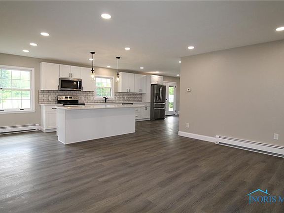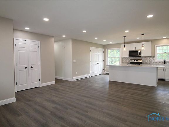 Quality rehabbed Swanton Ranch on 2.5 Acres. Open layout w 3 Beds and 3 Full Baths, Spacious Quartz Island Eat-in Kitchen w shaker soft close cabinets, subway tile backsplash, stainless French door refrigerator, stove, dishwasher, & microwave. All bathrooms updated, vanities, tub, toilets, Primary has a walk-in tiled shower. New Roof, gutters, paint, doors inside & out, flooring (vinyl plank & carpet) fixtures, can lights, HWT, Water softner, & landscaping. 2 sets of double French doors lead to deep backyard. Covered Patio. 2 car side entry attached garage. All on one Level! Home Warranty Incl