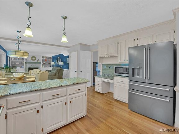 Welcome to this beautifully updated residence blending charm with modern convenience. Nestled on a generous .84-acre lot, this 2,306 sq. ft. home, ideal for comfortable living & entertaining. It features 4 bedrooms, 2 1/2 baths. The home's exterior boasts curb appeal with gorgeous landscaping, paved drive way, a two-car rear-loaded finished garage, door to kitchen provides direct access, simplifying grocery unloading. Enjoy summer evenings on the charming back patio, accessible via French doors from the large family room. Inside, rich hardwood flooring throughout the first floor. The family room is a standout feature, with a stunning brick wood-burning fireplace, built-in bookshelves, cabinets, crown molding, a chair rail, and shiplap accents enhance its elegance. The kitchen is the heart of the home, with granite countertops, smooth top cooking, a large pantry, abundant cabinets, built-in desk and breakfast area/morning room for everyday enjoyment. The formal dining room is sophisticated, with crown molding, a chair rail, & an elegant light fixture. Charming half bath for guest with tiled floor & wainscoting. Upstairs, the primary bedroom is a spacious retreat with a walk-in closet & ensuite featuring stylish tile floor, gorgeous tiled walk-in shower, double sink vanity, linen closet, and skylight adding that nice natural light. The second bedroom offers luxury vinyl plank flooring, a large space to create play or study area, & two closets. One closet leads to the walk up attic with plenty of storage space. The third bedroom has a double-door closet, while the fourth includes a walk-in closet & dormer windows. The hall bathroom features a tiled floor, shower/tub combination, double sink vanity, & skylight. The laundry room with a tiled floor & ample space. Located in a desirable neighborhood. Easy access to 288, Powhite Pkwy, shopping and restaurants. Don’t miss out on making this exceptional house your forever home. Schedule your showing today!