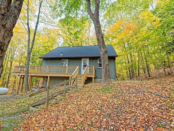 Escape to your own Upstate New York retreat on peaceful Blue Factory Hill Road. Tucked among the trees on nearly two acres, this charming home blends rustic character with modern updates. Step inside to find warm wood accents, vaulted ceilings, and a cozy stone feature wall that creates a true cabin-in-the-woods feel. The open main living area flows to a brand-new wraparound deck—perfect for morning coffee or evening sunsets surrounded by nature.
