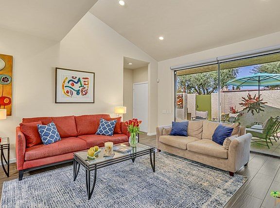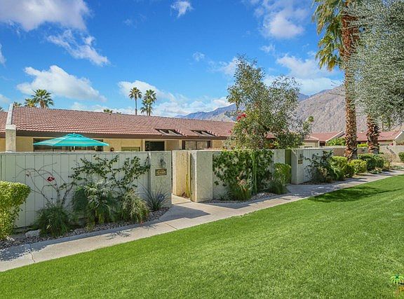 All the work has been done for you with this stunning, industrial-modern design in the heart of downtown Palm Springs. Meticulously reconfigured with heightened ceilings and an expansive, open floorplan, youll enjoy a huge, modern chefs kitchen bathed in sleek, white Euro-gloss cabinetry, quartz countertops, stainless steel appliances and glass tile backsplash. A free-floating, floor to ceiling, limestone fireplace and custom-designed, industrial lighting fixture define the dining and living areas as both unique and sophisticated. Bathrooms continue the modern theme with glass enclosures, tile accents, and rain shower features. With beautiful porcelain, wood-plank tile flooring throughout, separate bar area with dual zone wine refrigerator, multiple skylights, and clerestory windows, the unmistakable Palm Springs flair is evident the moment you enter your private, oversized courtyard featuring majestic mountain views. The homes prime location within the desirable, gated interior of the Palm Regency complex offers direct access to a gorgeous greenbelt, large pool and spa, and the ultimate in resort-style living.Fantastic walk-to-town location means you can be car free. HOA Dues include roof, exterior paint, water, trash and more! Move in-unpack and enjoy!
