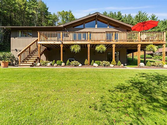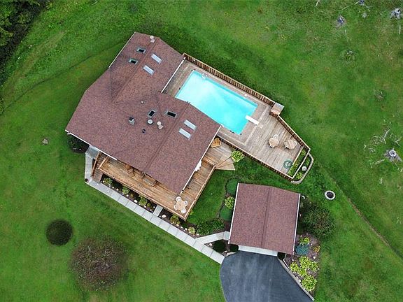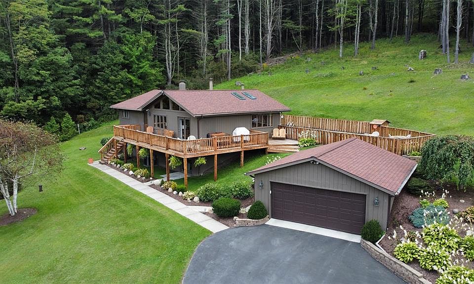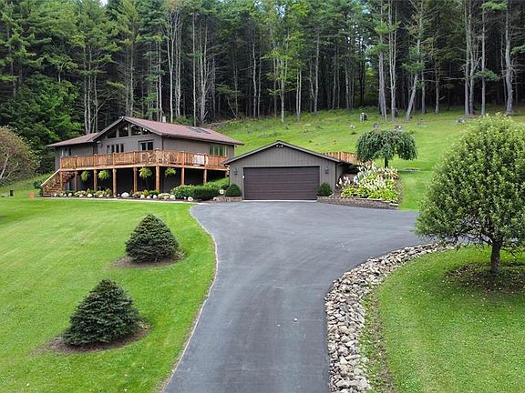 Gorgeous raised ranch sits on over 4 beautiful acres located just 25 miles from Ithaca/12 miles from Owego. This home is completely updated and has been impeccably maintained. Granite kitchen w/stainless Steel appliances, built in wine rack, and pantry. Cathedral tongue and groove pine ceilings throughout. Open living room w/fireplace and pristine bamboo floors throughout. Main floor consist of 2 bedrooms on one end and Master bedroom addition with fireplace on the other. Finished walkout lower level w/hard wood floors, family room w/bar and fireplace, workshop, plenty of storage, a bright spacious laundry room and two French doors leading outside. Enjoy the views from the front wrap around deck, or sitting by the inground pool! Major upgrades include a new house and garage roof in 2018, newer Anderson windows, doors skylights, appliances, central air, flooring, 6 panel solid doors, 200 amp service, Generator ready panel. 22x22 two car garage and a separate storage garage in back.