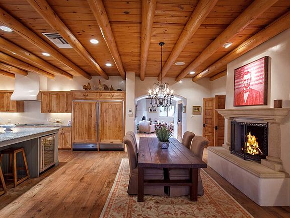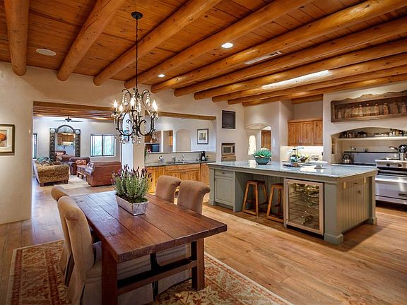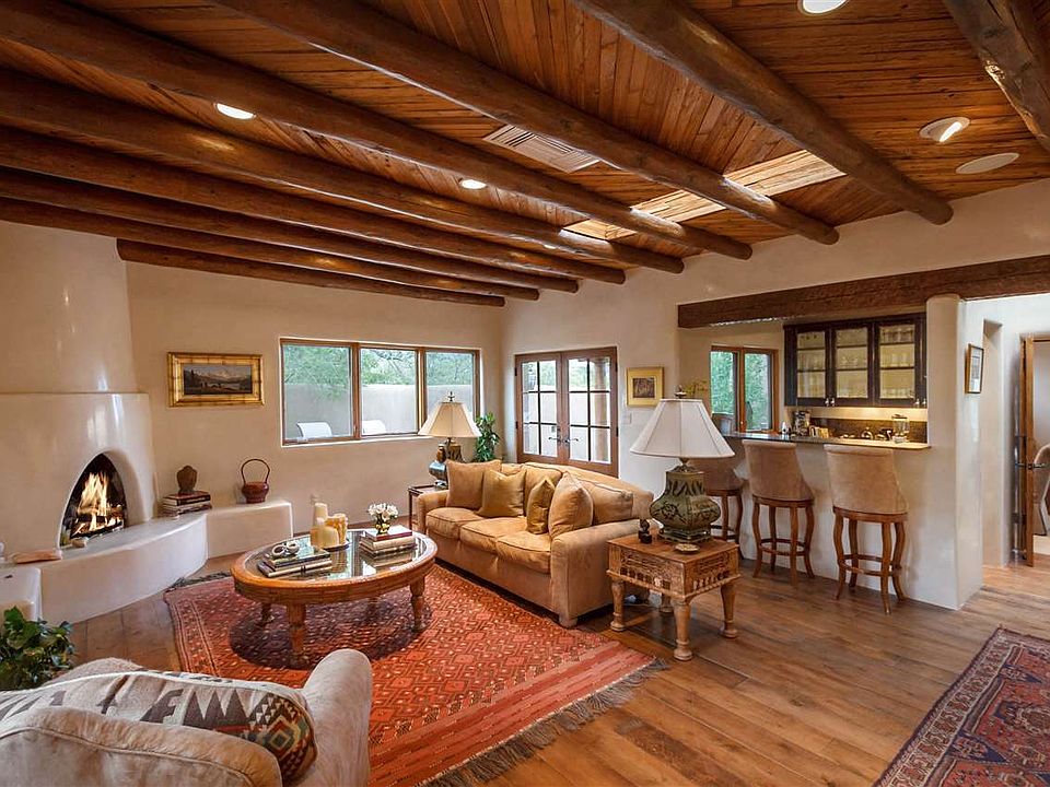 The perfect in town family compound! This classic Pueblo revival house and guest house sits on a knoll top with great views to the west. The location is close in yet the property has a rural residential feeling due to the site, mature landscape and acreage. Thoroughly up-dated through the years, features you would expect to find in a new luxury home are all here, in addition to the charm and warmth. Diamond plaster walls, beautiful vigas and beams, wood floors, wine closet, every kitchen built-in you can think of, granite counters throughout, nine fireplaces and a floor plan that accommodates a large family or several hundred guests. The separation of bedrooms and public spaces is excellent and the guest house is completely detached from the home. The property includes a playground, vegetable gardens and fruit trees, lawns, landscaped terraces and multiple unique private outdoor areas. A large paved driveway with good parking and five garage spaces offer many options.
