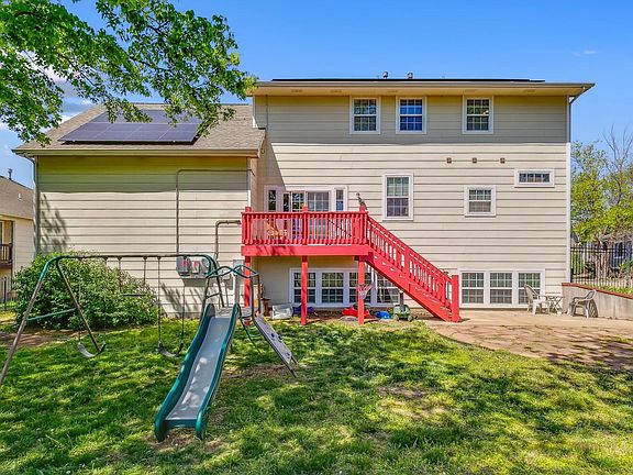 This enormous 6 bed / 3 full bath home sits on a cul-de-sac, just around the corner from the elementary school, an easy walk for the kids. A fully fenced backyard equipped for an electric pet fence, and a deck for enjoying that morning coffee, this home comes with a huge kitchen with a convection oven and a five burner stove, with ample storage space inside of soft-close cabinets and drawers, and opens into the dining room and large family room equipped with a gas fireplace. Get laundry done quicker by doing your laundry in the pantry while also doing laundry upstairs next to a full bath and four large bedrooms, including a bonus room hidden past a walk-in closet. The basement includes another full bath and bedroom and tons of storage space as well as storage in the loft area of the two car garage. Check out the master suite with a huge on-suite master bath equipped with a Jacuzzi tub as well as dual shower heads and bluetooth speakers in the large tile shower, both of which come with white and blue mood lighting, and don't forget his and her vanities and a walk-in closet. New roof in 2021, and solar panels in 2022 that vastly reduce the monthly energy costs and can even pay you back. Right off of Rock Road and 3 minutes from K-15, with a neighborhood pool within walking distance. Request a tour today!