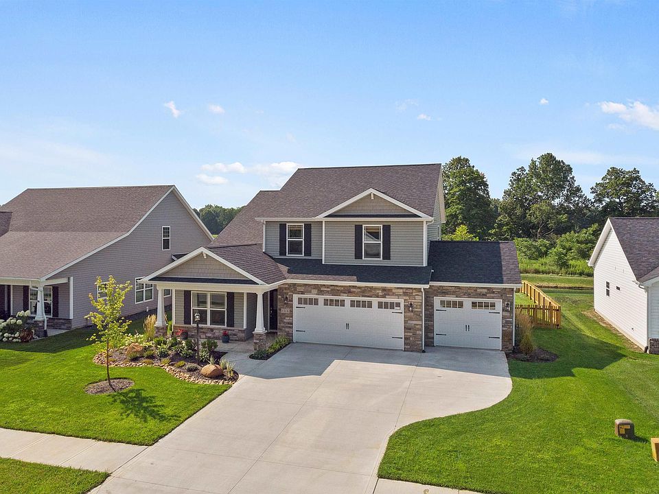 OPEN HOUSE CANCELLED! Incredible opportunity to own this gorgeous, move-in ready 2-story home boasting an open concept layout, luxurious main floor primary suite, vaulted great room & expansive fenced back yard! Located in the popular Tuscany neighborhood just off S 250 E & nestled on a 0.23 acre lot backing up to a small pond, this 4 bedroom, 2.5 bath has lots to love & much to offer! Masterfully crafted in 2019 by Majestic Custom Homes, the Alexander III design offers almost 2,300 finished sqft along with an attached 3 car garage & loads of curb appeal. Well maintained from outside in, attractive exterior is mix of vinyl & stone facade with an inviting covered porch & beautiful professional landscaping with irrigation! Inside the beveled glass front door you’ll find a bright & welcoming atmosphere complemented by quality construction & a soft neutral color palette—the perfect backdrop to your own personal style! French doors off foyer open to an impressive formal dining room with tray ceiling great for entertaining! Dining links to spacious kitchen with abundant cabinetry, granite counters, tile backsplash, SS Frigidaire appliances, recessed lighting, pantry & wrap around breakfast bar dividing kitchen from main living. Stunning living room features soaring ceiling, modern gas log fireplace & tons of natural light with scenic backyard views. Fabulous main floor primary bedroom has tray ceiling, walk-in closet & en suite with large soaking tub, dual sink vanity & walk-in tile shower. Half bath off living behind pocket door with pedestal sink & laundry off kitchen behind sliding barn door completes first level. (Note: Sale excludes washer/dryer; includes all new blinds.) Upstairs are 3 more comfortably sized bedrooms with ample storage throughout. 2 of the bedrooms share a Jack-n-Jill bath with dual sink vanity & separate commode/shower room. At the top of the stairs there’s also a bonus landing that overlooks the living room & can be used as a sitting/reading area or flex space. Big back yard has private feel as there are no homes behind, just a sliver of pond & open field directly across for peaceful nature views. Oversized patio is ideal for dining al fresco, grilling & chilling, or simply relaxing with a beverage of your choice at the end of a long day. Neighborhood is good for strolling as there is minimal through traffic. Conveniently located minutes from US-30 for easy access to shopping, dining & groceries. This won't last long—take action today!