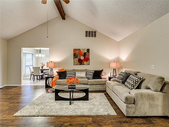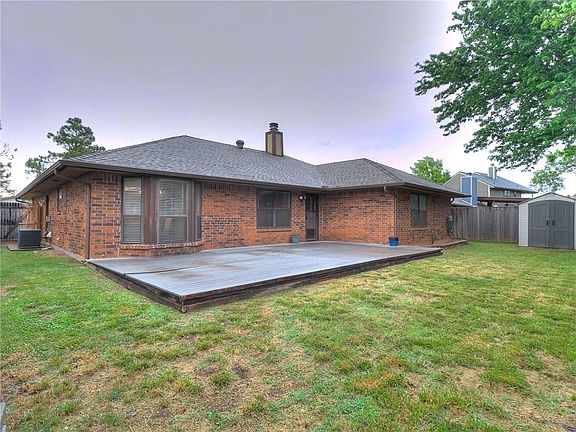 SO MUCH SPACE!!! This adorable and affordable Edmond home is totally move in ready! Vaulted ceiling in the living room with fireplace creates a spacious yet welcoming area open to the dining space off the kitchen. NEW beautiful dark wood-like laminate floors in living and master bedroom are durable for high-traffic areas and great for pets. Updated master bathroom vanity includes 2 sinks, walk-in closet. The secondary bedrooms are HUGE! You don't see bedrooms this large very often. Backyard is complete with large trex deck which will last for years to come. Fence and roof are only a few years old. Storm shelter in garage! Storage building in backyard stays with home.