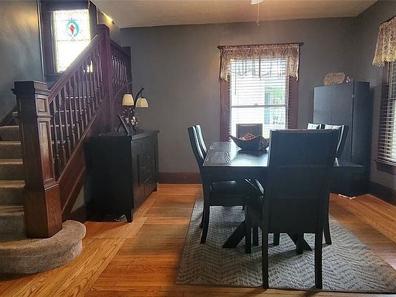 Charming 3 possible 4 bedroom (Master bedroom could be converted back) 1.5 bath Colonial home with hardwood floors, natural woodwork, stained glass windows, french doors, gas fireplace and sunlit kitchen. Full attic that could be additional living space. Lots of updates including total tear off of roof on house August of 2014, total tear off of garage roof August 2021, both bathrooms have been totally remodeled, brand new high efficiency furnace 2017, kitchen has been painted and new floors and appliances, freshly painted throughout. Beautiful open front porch to sit on and enjoy the summer evenings.