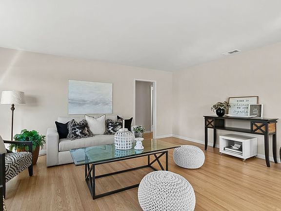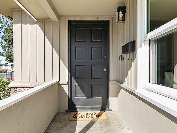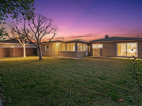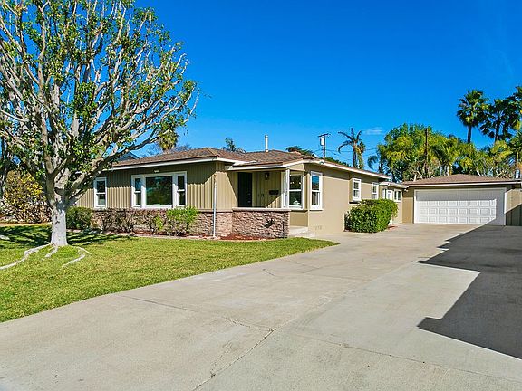 Welcome to your dream mid-century modern single-level home, blending timeless design with modern updates - Situated on an expansive lot, offering lush front & rear lawns, a detached garage, and an enclosed patio with endless possibilities. From the curb, imagine family gatherings with little ones playing on the spacious front lawn and vehicles easily accommodated in the extended driveway. Step through the charming covered porch into a warm and inviting interior, where refinished original narrow-plank hardwood floors greet you in the open-concept living and dining areas. Natural light streams through the dual-pane picture window creating a bright and airy ambiance in every corner. Modern conveniences abound, including new lighting, hard surface flooring, and fresh paint. The updated kitchen is a chef’s delight, featuring quartz countertops, a clay-fired single-basin sink, a pull-out faucet, stainless steel 5-burner gas range and dishwasher—and freshly painted custom cabinets. Adjacent to the central kitchen dining nook is a cozy family room with a raised hearth fireplace and skylight, perfect for relaxing or entertaining. The home’s thoughtful layout provides privacy and comfort for all. Two front bedrooms, including one with a built-in Murphy bed, share a hallway bathroom complete with a walk-in shower and separate tub. Moving towards the rear of the home, you’ll discover ceiling to floor hall cabinetry, a secondary bedroom with built-in drawers, and the serene primary retreat. The primary suite features a modern walk-in closet, sliding doors to the verdant backyard, and an en-suite bathroom with hall access, fresh lighting, and paint. The surprises don’t stop there! A fully enclosed patio, complete with ceiling fans and access to the back/front yards & detached garage, offers endless possibilities. This versatile bonus space could serve as an additional living area, a daycare room - or with city approval - even a future ADU (Accessory Dwelling Unit) in combination with the detached garage. Additional features include gorgeous original mid-century wood doors, mature landscaping, dual water heaters (including one in the garage), a utility sink in the garage, grab bars in the shower, updated fascia, and fresh interior and exterior paint. Conveniently located near public transportation, top-rated schools, retail, medical facilities, major freeways, and just minutes from Disneyland, this home offers the perfect combination of comfort, style, and accessibility.