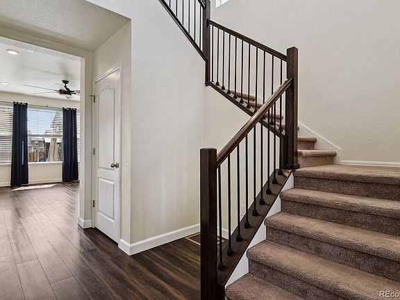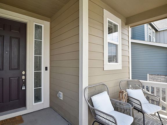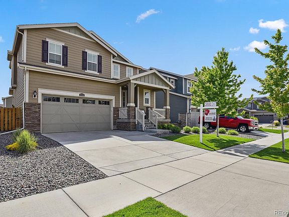 This beautiful 4-bedroom, 4-bath home includes numerous upgrades & updates you won't find in other houses. The enhancements start before you even enter, with stone accents extending below the covered front porch. Inside, the open staircase & volume ceilings in the foyer—an expensive upgrade—replace closed walls with a dramatic & stunning entrance. Follow the luxury vinyl plank flooring into the open & airy great room, filled with abundant natural light from a wall of windows & oversized glass door. The dining area offers plenty of space for gatherings & blends seamlessly into the kitchen, where a breakfast bar at the large island invites conversation. Granite counters, a full tile backsplash, pendant lighting & light cabinetry enhance both beauty & function. The well-designed layout includes a huge walk-in pantry & stainless appliances—highlighted by a newer double oven with convection & air fryer features, & gas burners with a griddle. Upstairs, the primary bedroom features a tray ceiling, ceiling fan, spacious bathroom with a large walk-in shower, a double vanity with a makeup area, & a walk-in closet that’s practically the size of an office. Two additional bedrooms, a full bath with double vanities, & a laundry room complete this level. The professionally finished & permitted basement includes a generous living area, large bedroom, 3/4 bath, & extra storage. Outside, the yard is larger than most in the neighborhood & features an impressive paver patio, raised garden beds, & spaces to play or relax. Smart home features—including a SmartHub & 2 WiFi modems—keep you connected with ease. This home is within walking distance of the elementary school, several parks, & the community pool. Bison Ridge Recreation Center & King Soopers are less than five minutes away, with the Prairie Center shopping district offering great dining & retail options just 12 minutes down the road—and golf just 10 minutes away. A bonus: solar panels on Sunnova’s 20/20 plan save on electricity!