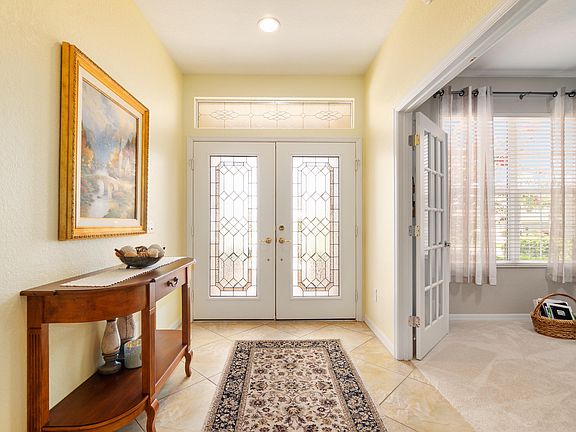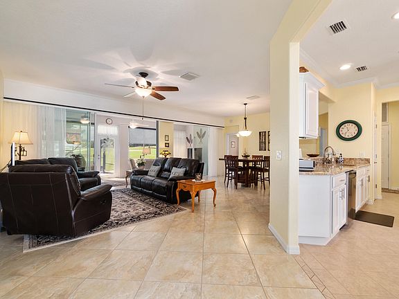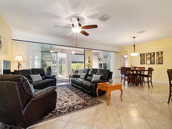 SUPBERB MOVE-IN READY GOLF COURSE HOME IN DEL WEBB SPRUCE CREEK GOLF & COUNTRY CLUB. This home boasts glass double-door entry, new HVAC 2018, French doors on den and porcelain tile flooring in living room and dining room and ceramic tile flooring in kitchen, guest bathroom and laundry room. Kitchen has white cabinets, granite counters and stainless steel appliances. Remodeled bathrooms have newer granite. Master bathroom has newer shower and enclosure, granite, newer sinks and waterproof laminate flooring. Enlarge master walk-in closet. Carpet in den and bedrooms new in 2017. Enclosed lanai under heat and air plus large patio with birdcage. This updated home is well cared for. Monthly HOA $135.00 includes security, common area maintenance, trash removal and use of the amenities.