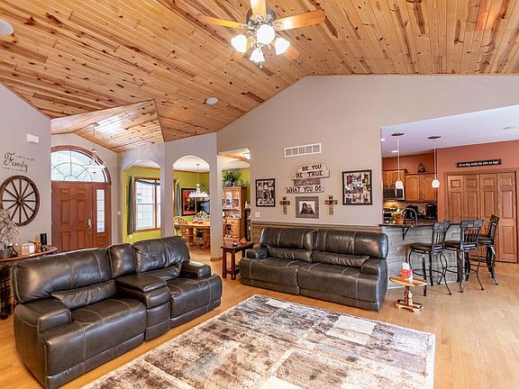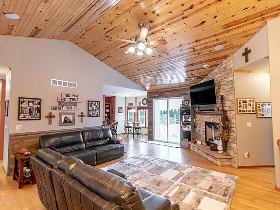 The weather outside is Frightful but Delightful in this 5 bedroom custom ranch situated on 4.23 acres. Vaulted ceilings, Hdwd floors & sliding doors in gracious size Lvrm w/gas FP. Formal Dnrm, ample cabinetry in kitchen w/granite counter tops, pantry, built ins, dinette area & SS steel appliances. Master bedroom w/tray Pine ceiling, walk-in closets, private bath w/huge walk-in shower & sliding doors that lead to patio, hot tub & heated in-ground pool. 1st floor laundry, zoned heating, generator & most windows newer throughout. Great entertainment space in finished walkout basement including , large wet bar area w/access to garage. Sprinkler system, C/A, Bonus, 54 x 60 heated outbuilding with 12,000 lb car lift. additional lean too outbuilding. Minutes to I-94 for an easy commute!