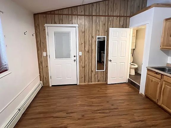 Renovated 1 bedroom 1 bath house with washer and dryer across front door.