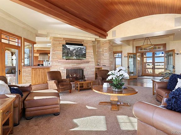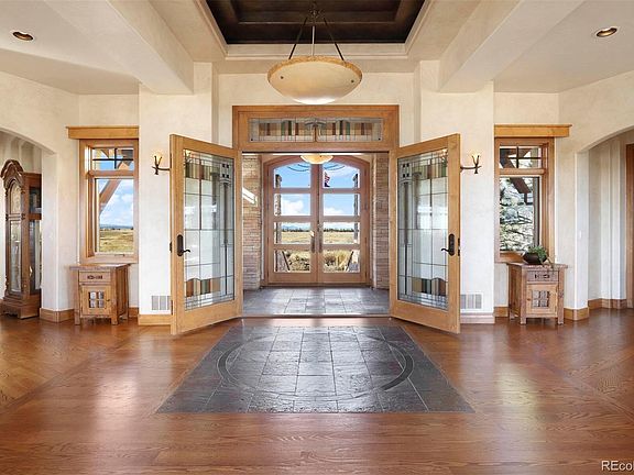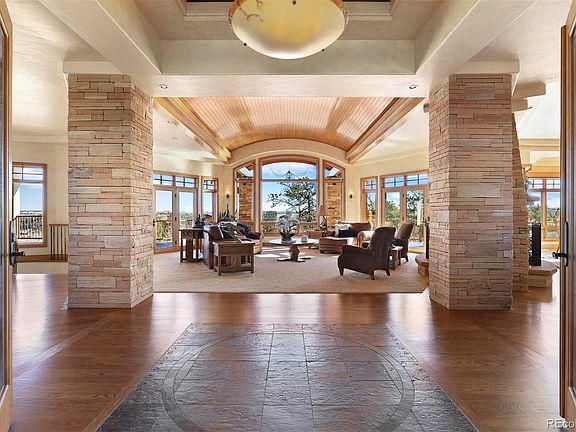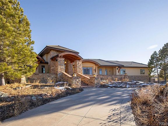Situated on 71 private acres with breathtaking Front Range and Castlewood Canyon views, this custom-built, 4 bed, 7 bath, main-floor-master ranch home is truly a rare find. Featuring gorgeous stacked stone and custom woodwork throughout as well as bright, open living spaces, the floor-to-ceiling windows maximize views and invite seamless indoor;outdoor living. The heart of this home lies in an enormous Great Room that opens to a huge outdoor deck with views all around, fire pit, and built-in gas grill. The open concept kitchen features top-of-the-line finishes and appliances and includes a hearth room and wet bar. A huge master suite with spa-inspired bathroom, sitting area, and views of the Canyon sits adjacent to a large office. A dining room, laundry room, and two powder rooms complete the main level. Above the 4-car, attached garage sits a separate guest wing complete with en-suite bath, attached office/utility room, and amazing views. The lower level boasts 2 additional en-suite bedrooms, huge recreation room leading to a large patio with hot tub, wet bar, and climate controlled, 800-bottle wine room. The soundproof theater room easily seats 16. A powder room, and unfinished storage space complete the lower level. Located adjacent to the home is an outbuilding with almost 3,000 sf that includes a workshop, office, and additional car storage, as well as a separate covered RV storage space. This incredible property also includes a spectacular water feature consisting of a large, useable 2-acre upper lake with a private dock perfect for kayaking and paddle boarding and three additional downhill ponds. All ponds are interconnected with a series of streams that contain seven waterfalls, underwater lighting, and a series of sitting benches. Adjacent to conversation land. Located in a gated community and minutes away from downtown Castle Rock, Colorado, this combined family and entertainers' home is one that you don't want to miss! *See Features List in Supplements*
