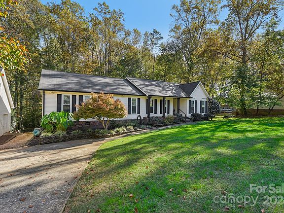 This spacious ranch home is situated on a large lot and includes a detached garage. The property features four bedrooms and three full bathrooms, along with a sizable recreation room in the basement, making it an ideal layout. The expansive family room boasts vaulted ceilings and a cozy brick fireplace. The primary suite is also roomy and includes a sitting area that can be used as office space. There is plenty of unfinished space in the basement for a workshop and storage and additional space above the garage for hobbies or potential future projects. Other highlights include a covered porch, a circular driveway, and a carport. With a private setting and no HOA, you can even bring your chickens! The home is conveniently located near the White Water Center and offers easy access to Highway 485, Charlotte, and Gaston County.