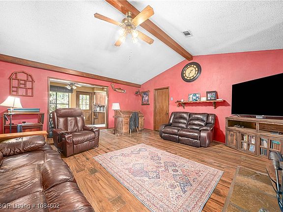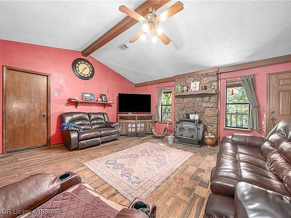 Tucked away among mature trees, this charming cabin offers the perfect mix of comfort and nature. You’ll love the privacy, open skies, and wildlife that come with 5 wooded acres. Come winter enjoy a nice evening in front of the wood stove that is surrounded by Arkansas stone. 2 car carport plus 2 car oversized garage. Bring your coffee to the porch, listen to the birds, and unwind in your own secluded paradise. Wet weather streams runs thru the property. There are water ditches that take water thru the property. There is a guest house that needs gutted and re-done. There is also an above ground pool that needs work (not sure what it needs).