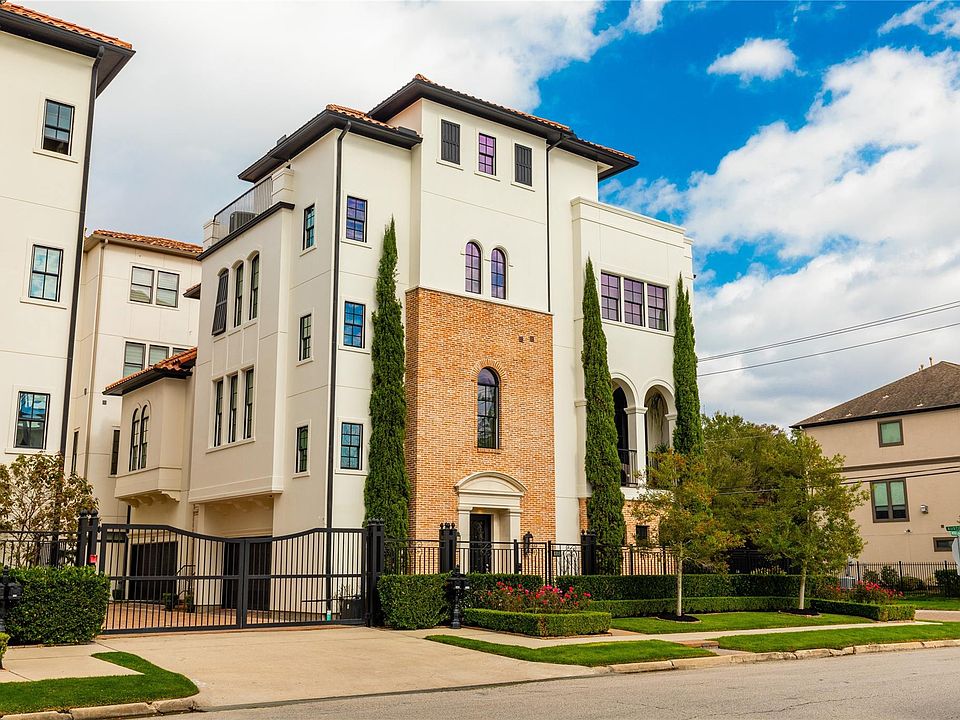 Sophisticated design & modern luxury embody this gracefully appointed townhome located in the heart of the Museum District. Soaring ceilings & exquisite decorative molding detail accentuate the light filled open concept kitchen, dining & living room perfect for hosting. Professional kitchen with Miele appliances, abundant soft close cabinetry & breakfast bar. The luxurious primary suite presents a spa-like ensuite bath, well appointed custom closet & convenient access to laundry room. Private bedrooms, all with sleek ensuite baths & generous closets. Elevator access to all floors and sweeping staircase culminate to a large game/media room with private bath and open-air terrace boasting a gas fireplace and exquisite views. Beautifully situated on a corner lot with private gated entry, front and side greenspace & 3 open air terraces. This Ecohip green home is just a short walk to the highly acclaimed Museum of Fine Arts, Cullen Sculpture Garden, Herman Park/Zoo, local dining & More!