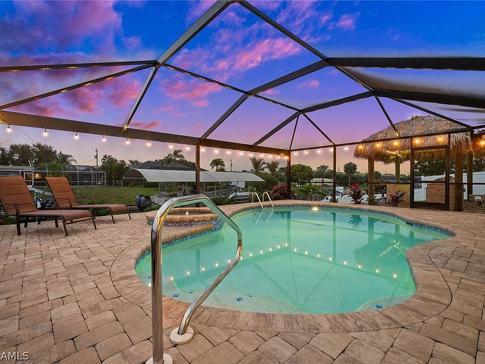 Outside, the recently redone exterior is perfect to experience the fantastic SW Florida weather. Extensive brick pavers surround the pool area and lanai, tiki hut, and path to the dock. The large covered lanai overlooks the beautiful heated pool and spa. The highlight of the outdoor space is the gorgeous tiki hut equipped with a full kitchen, dual grills, a bar, a ceiling fan, and even a TV, making it an entertainer's dream.