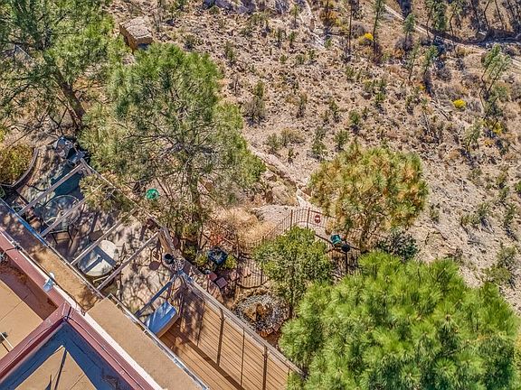 Gorgeous two-story canyon home with stunning views! Beautiful curb appeal with mature landscaping and an inviting flagstone courtyard with a stone water feature. Glass doors lead to an entryway/coat room that gives access to the two car garage and the main home. A galley style kitchen with vaulted Viga wood ceiling and upper windows gives the space great natural lighting. Wood cabinets with a plank detail on the doors. Hard surface counters with tile backsplash, stainless steel appliances and a pass through window above the stove overlooking the Living room. Open Living/Dining space with Viga wood ceilings, a large wood burning fireplace with elevated hearth and a wall of windows and sliding doors leading to the large patio with retractable awning. And another stone water feature to overload the senses while you take in the picturesque views of the canyon. Two large guest bedrooms, one with access to the backyard patio, a guest bath, and a nice sized laundry room complete the first floor. The second floor is completely dedicated as the Primary En-Suite. A Spacious carpeted area with the same show stopping ceilings as the rest of the home, room for a sitting area, a walk-in closet, and sliding glass doors leading to your private wood deck to give you a different point of view of the canyon. Large Primary bathroom with double sink wood vanity, skylight and a walk-in tile shower with glass doors and modern light fixtures. Act fast because this beauty wont last!